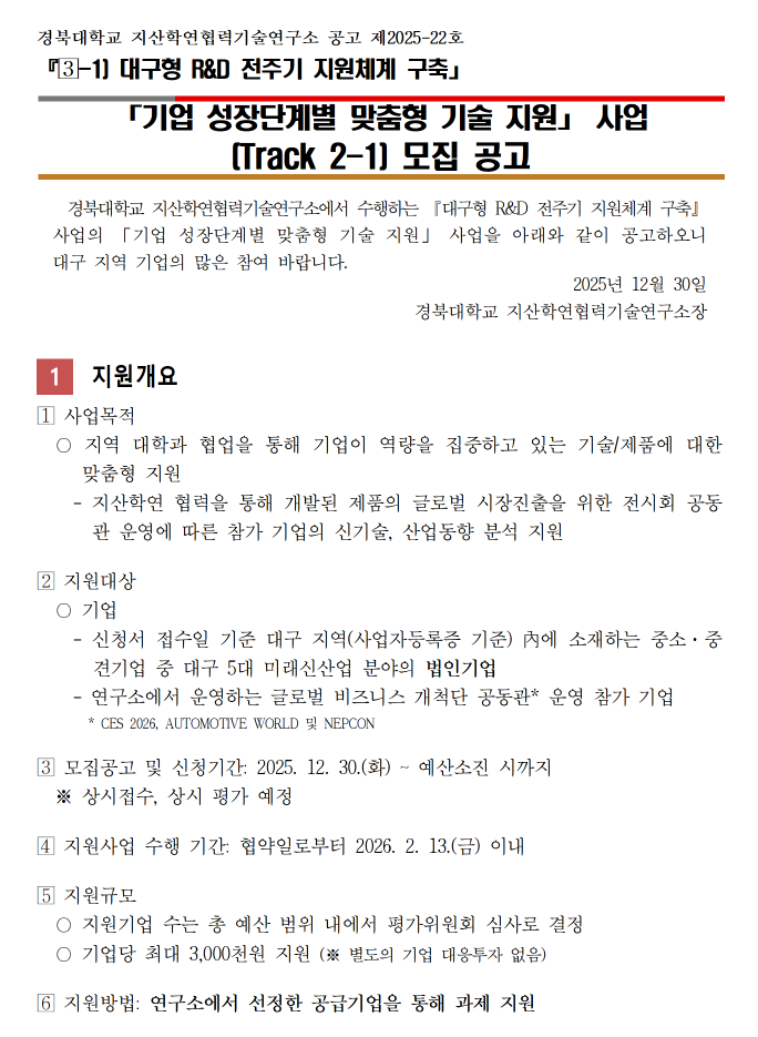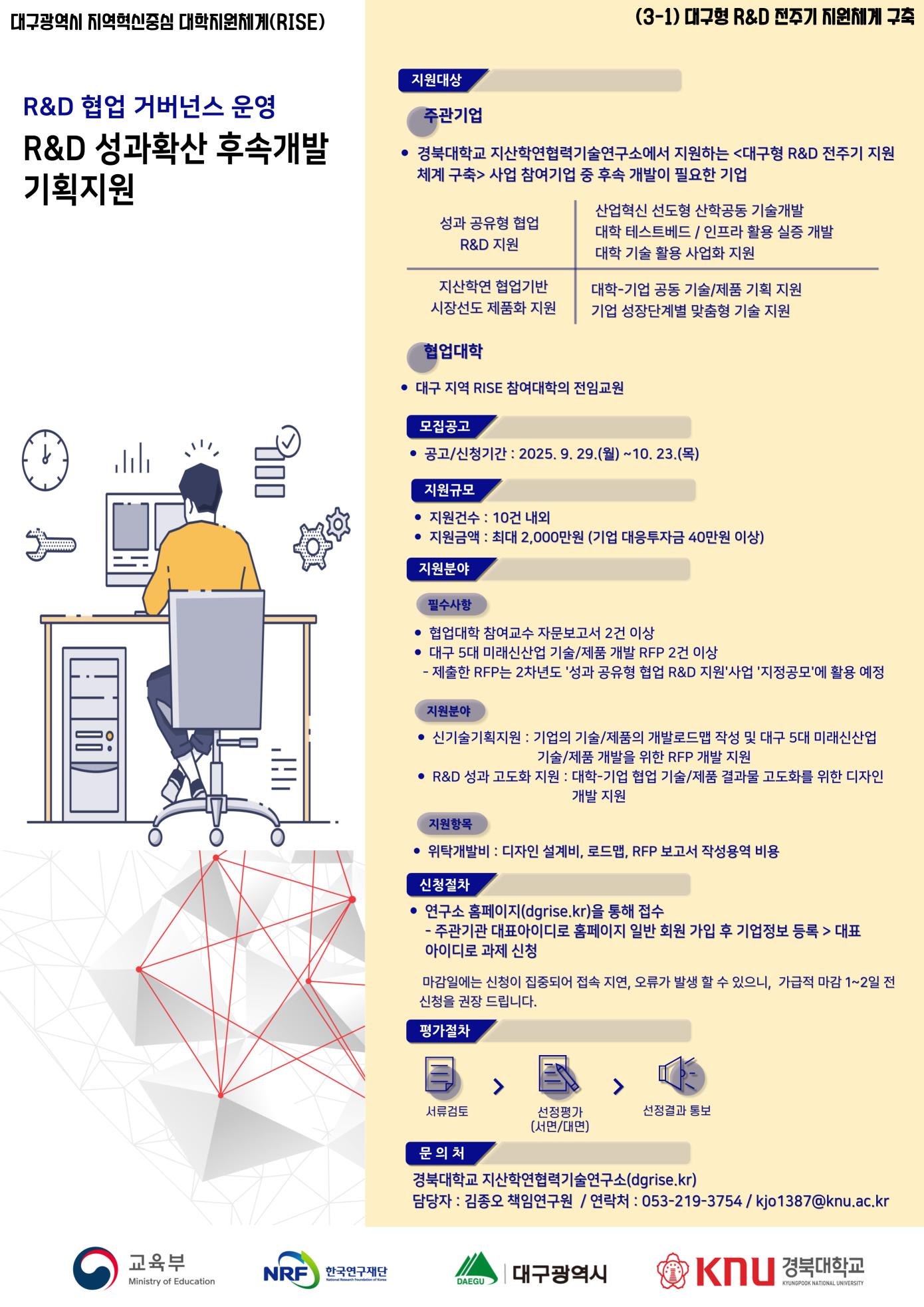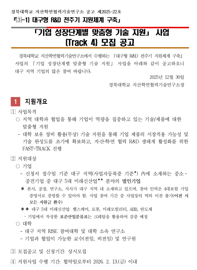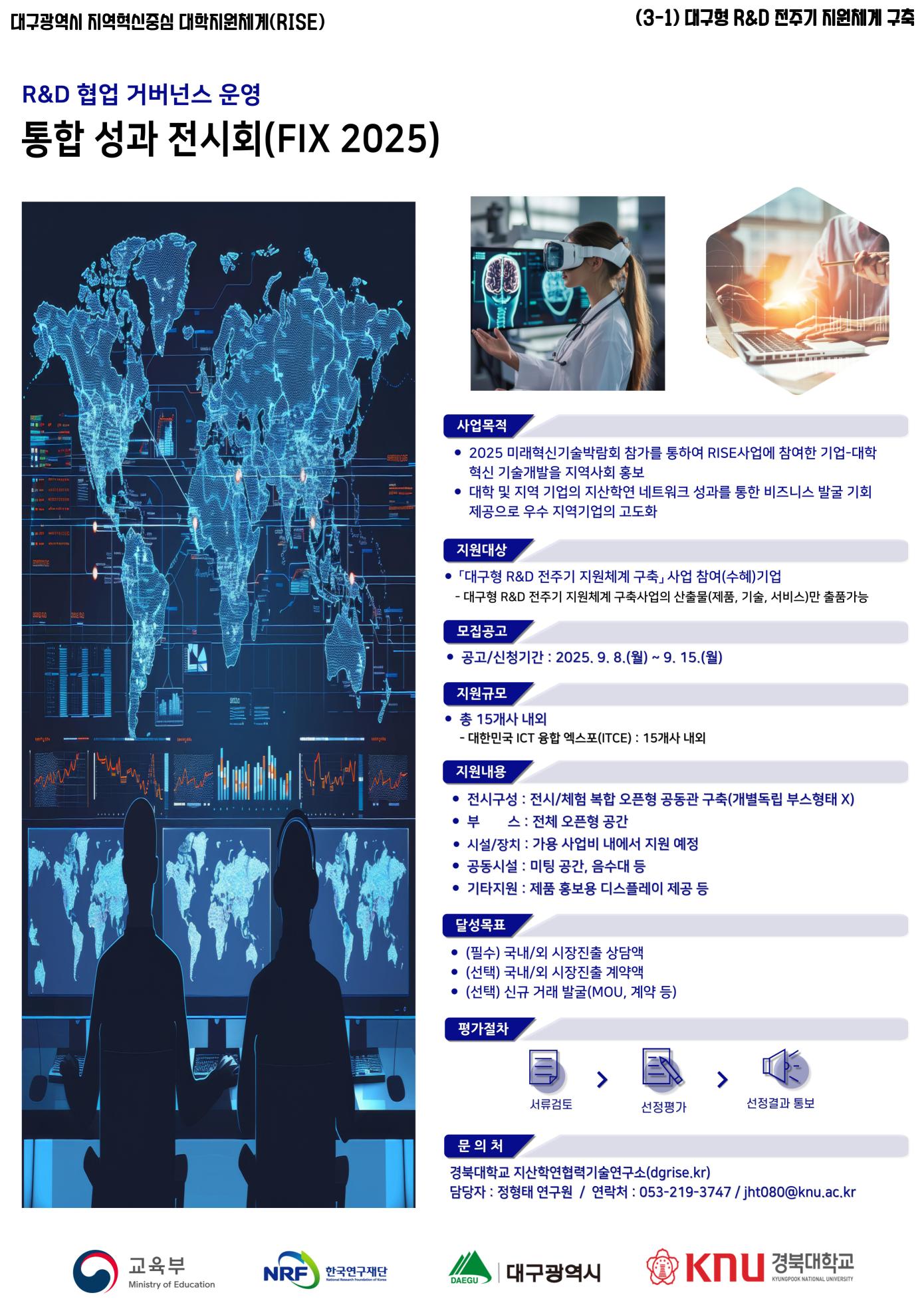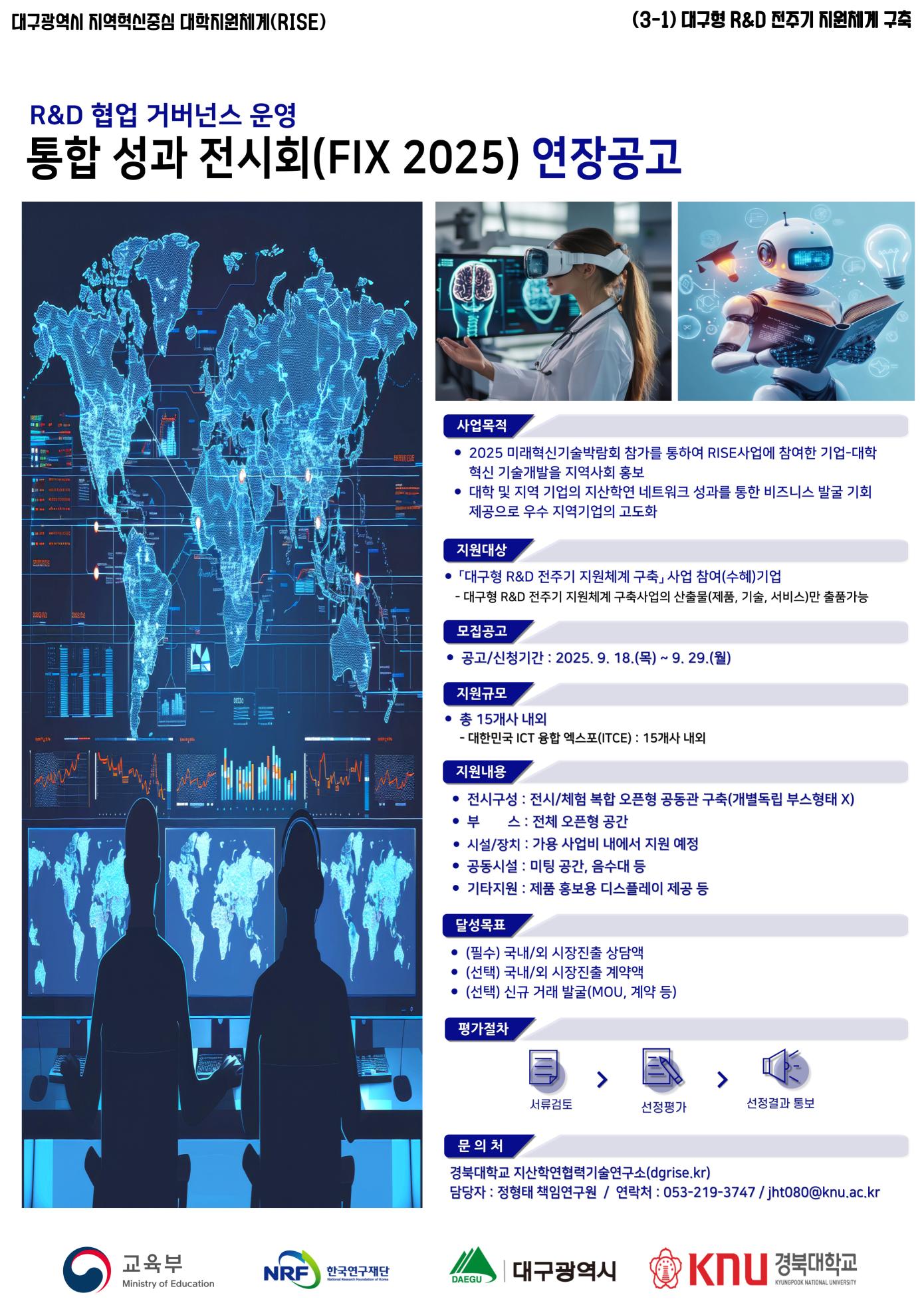 - 「대구형 R&D 전주기 지원체계 구축」 사업 전문가 모집 공고(~ 25. 8. 31.) 2025.07.07